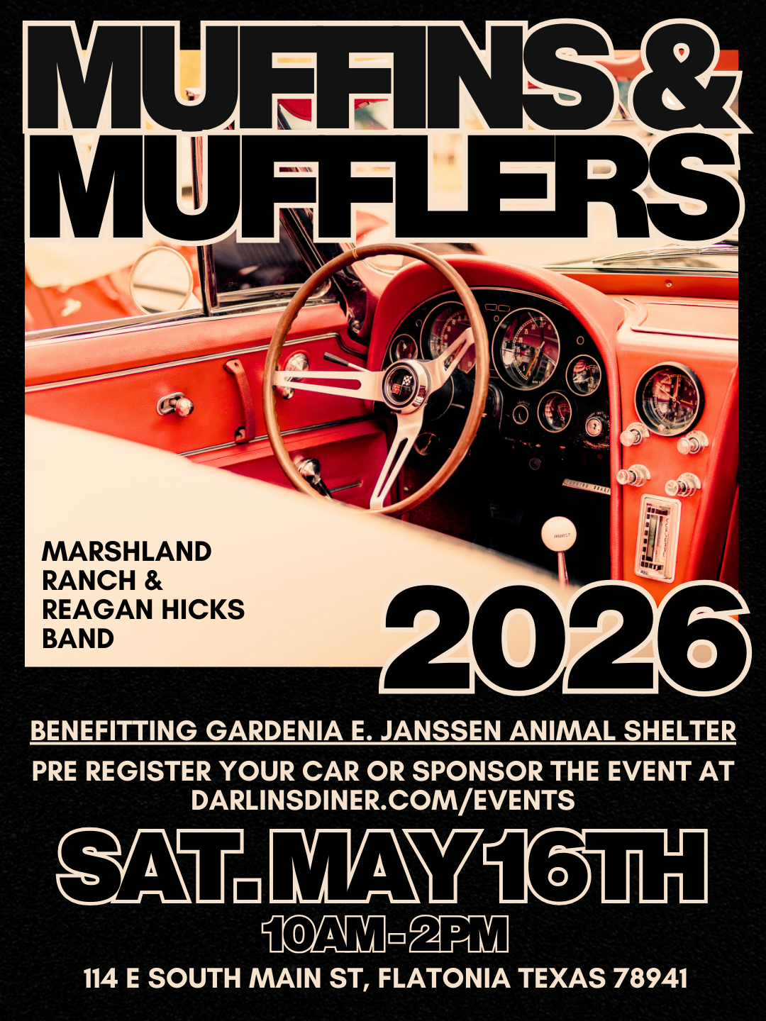 A much appreciated donation to Muffins & Mufflers 2025 will not only help fund this awesome community event, but help Gardenia E. Janssen Animal Shelter out of La Grange, Texas maintain and operate a humane animal care facility to provide temporary care to homeless, unwanted or displaced animals, as well as, provide opportunities for all community members to participate in activities through volunteer and foster programs!